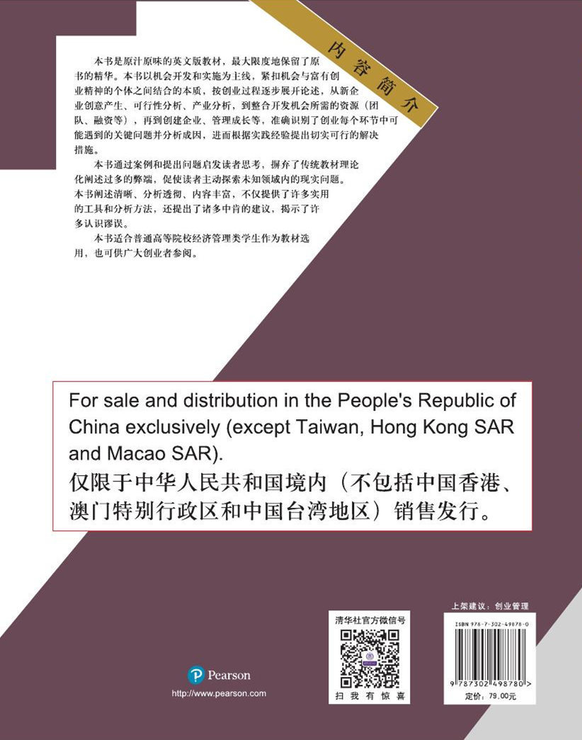 本书是原汁原味的英文版教材,最大限度保留了原书的精华。本书以机会开发和实施为主线,紧扣机会与富有创业精神的个体之间结合的本质,按创业过程逐步展开论述,从新企业创意产生、可行性分析、产业分析,到整合开发机会所需的资源(团队、融资等),再到创建企业、管理成长等,准确识别了创业每个环节中可能遇到的关键问题并分析成因,进而根据实践经验提出切实可行的解决措施。 本书通过案例和提出问题启发读者思考,摒弃了传统教材理论化阐述过多的弊端,促使读者主动探索未知领域内的现实问题。本书阐述清晰、分析透彻、内容丰富,不仅提供了许多实用的工具和分析方法,还提出了诸多中肯的建议,揭示了许多认识谬误。 本书适合普通高等院校经济管理类学生作为教材选用,也可供广大创业者参阅。