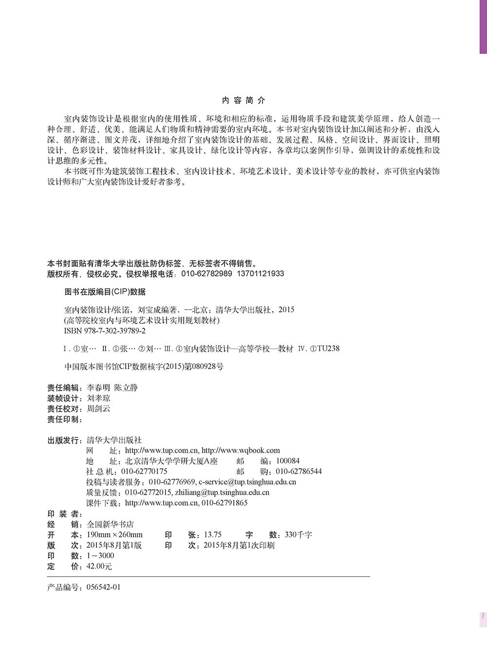 室内装饰设计是根据室内的使用性质、环境和相应的标准,运用物质手段和建筑美学原理,给人创造一种合理、舒适、优美、能满足人们物质和精神需要的室内环境。本书对室内装饰设计加以阐述和分析,由浅入深、循序渐进、图文并茂,详细地介绍了室内装饰设计的基础、发展过程、风格、空间设计、界面设计、照明设计、色彩设计、装饰材料设计、家具设计、绿化设计等内容,各章均以案例作引导,强调设计的系统性和设 计思维的多元性。 本书既可作为建筑装饰工程技术、室内设计技术、环境艺术设计、美术设计等专业的教材,亦可供室内装饰设计师和广大室内装饰设计爱好者参考。