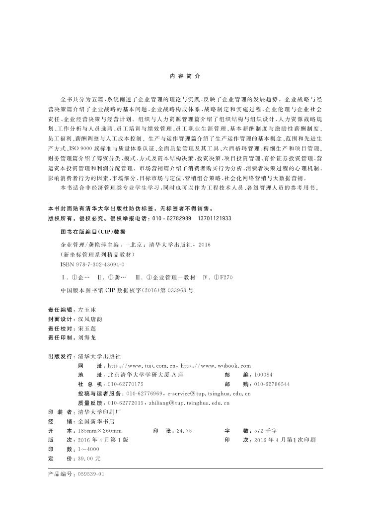 全书共分为五篇,系统阐述了企业管理的理论与实践,反映了企业管理的发展趋势。企业战略与经营决策篇介绍了企业战略的基本问题、企业战略构成体系、战略制定和实施过程、企业伦理与企业社会责任、企业经营决策与经营计划。组织与人力资源管理篇介绍了组织结构与组织设计、人力资源战略规划、工作分析与人员选聘、员工培训与绩效管理、员工职业生涯管理、基本薪酬制度与激励性薪酬制度、员工福利、薪酬调整与人工成本控制。生产与运作管理篇介绍了生产运作管理的基本概念、范围和先进生产方式、ISO 9000族标准与质量体系认证、全面质量管理及其工具、六西格玛管理、精细生产和项目管理。财务管理篇介绍了筹资分类、模式、方式及资本结构决策、投资决策、项目投资管理、有价证券投资管理、营运资本投资管理和利润分配管理。市场营销篇介绍了消费者购买行为分析、消费者决策过程的心理机制、影响消费者行为的因素、市场细分、目标市场与定位、营销组合策略、社会化网络营销与大数据营销。 本书适合非经济管理类专业学生学习,同时也可以作为工程技术人员、各级管理人员的参考用书。