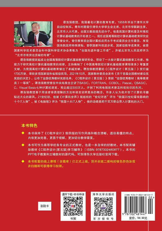 本书是初学者学习C程序设计的理想教材,可作为高等学校各专业的正式教材,也是一本自学的好教材。本书配有辅助教材《C程序设计(第五版)学习辅导》(ISBN: 9787302480877)。本书的PPT电子教案和主辅教材的源代码,可到清华大学出版社官网下载,与本书配合使用的数字资源也将陆续推出,供各高校教学使用。