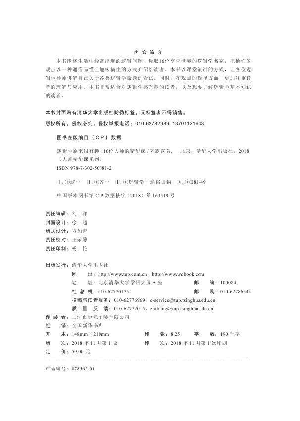 本书的重点不在于教授读者那些深奥的理论,或者让读者学习繁杂的知识来分析逻辑问题,而在于逐步引导读者,让读者能像逻辑学家一样思考,用逻辑学家的思维去思考问题,用逻辑学方式解决问题。本书能让你学会选择,做出正确的决策,理性生活,游刃有余。读懂逻辑学,你的生活就能多几份保障,你的未来也会更加光明!逻辑学是聪明人的选择,请翻开本书,开始你的逻辑学之旅吧。
