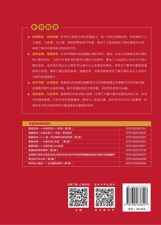 前言 专业导论类课程是大学生接受大学教育的第一门专业基础课,能够使大学新生对本专业的内涵特点、知识能力和未来发展有一个初步的认知概念和宏观了解。计算机类专业作为一个专业大类,包括计算机科学与技术、软件工程、网络工程、信息安全、物联网工程、数字媒体技术等细分专业,这些专业都属于计算机学科,因而有很多共性的思维方式和知识体系。本书作为国家级精品课程和省级一流课程的配套教材,提出并实施了“专业视角,认知学科;计算思维,抽象分层;工程思维,道德指引;始于问题,应用驱动;领会思想,引发思考”的教学思想。 首先梳理好基本的知识架构,再去学习日新月异的计算机技术,会让本书的学习事半功倍。本书由3部分组成,分别是认识篇、系统篇和工程篇,如图0.1所示,该结构体现了如下教学思想。 (1) 专业视角,认知学科: 认识篇从专业的角度认知计算机和计算机学科,认知计算机的工作原理和计算机系统,认知计算机学科的根本问题和思维方式,了解计算机学科的知识体系和能力要求,为学习计算机学科提供正确的方法指导。 (2) 计算思维,抽象分层: 系统篇采用自底向上的方式讨论计算机可以做什么以及是如何做的,使学生了解学科富有智慧的核心思想,以及计算思维在每一个分层的运用,培养学生面向学科的思维能力。 (3) 工程思维,道德指引: 工程篇通过典型案例、工程伦理、法律法规,使学生了解工程与社会的关系,形成团队合作、终身学习等工程素养,明确计算机从业人员的行为规范和职业道德。 图0.1本书的组织结构 在教学设计上,始于问题,应用驱动: 每一章首先在一个较高的抽象层次上、从应用的角度提出本章要讨论的顶层问题...