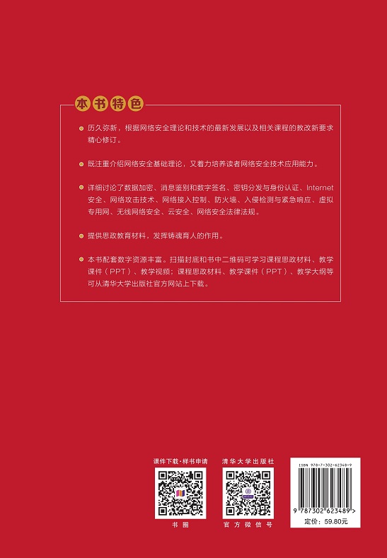 详细讨论了数据加密、消息鉴别和数字签名、密钥分发与身份认证、Internet安全、网络攻击技术、网络接入控制、防火墙、入侵检测与紧急响应、虚拟专用网、无线网络安全、云安全、网络安全法律法规。