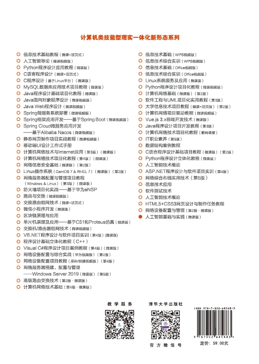 前言 人工智能的蓬勃发展给人们的生活带来巨大改变,为社会和经济发展注入动力。人工智能已经成为引领未来的战略性技术,是提升国家竞争力、推动经济增长的重要保障,人工智能也为社会治理提供了全新的技术和思路。 人工智能是一个正在高速发展的学科,过去一些对于人工智能的认知,在最近几年发生了根本性的变化,人工智能带来的突破是以前从未有过的,因此对人工智能的教育也需要进行不断创新,这一点对高职教育尤其重要。作为一本面向高职信息类专业学生的以人工智能基础为教学目标的教材来说,本书首先确立了教材内容的几个方面,即尽可能让学生了解得全面一些,在典型算法上让学生理解得深入一些,在部分场景上让学生应用得灵活一些。 基于以上思想,本书旨在为高职院校计算机相关专业的学生提供比较全面的人工智能基础知识,包括基础算法知识、实战开发技巧和应用案例等,培养学生具有人工智能思维和实战技能,帮助学生活用人工智能知识,力争做到理论知识“必需、够用”。同时,本书通过简单的案例讲解人工智能背后复杂的机制,由浅入深,帮助学生举一反三,在有限的学习时间中洞查人工智能领域的星辰大海。同时,本书充分考虑了高职教育的特点,重视以“问题驱动”“任务驱动”为导向,图文并茂。除经典内容外,本书还对当前新技术进行了相关介绍,使学生对人工智能技术的来龙去脉更加清晰。 学生通过本课程的学习,将为后续深造打下坚实基础。在学习本课程之前,学生至少需要学习Java、C#、Python等语言中的 一门,并且对该语言的开发环境熟练掌握。本书共分11章,建议108课时完成,以下是课时具体分布建议。 ...