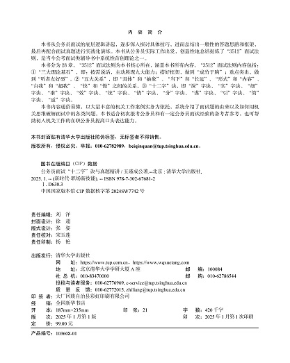"本书从公务员面试的底层逻辑讲起,逐步深入探讨具体技巧,进而总结出一般性的答题思路和框架,最后再配合面试真题进行实战化演练。本书从公务员实际工作出发,创造性地总结提炼了“3512”面试法则,是当今公考面试类辅导书中系统性首创理论之一。 本书分为 28 章,“3512”面试法则为本书核心所在,涵盖本书所有内容。“3512”面试法则内容包括:①“三大理论基石”,即:按需说话,主动展现九大能力;搭好框架,做到“成竹于胸”;重点突出,做到“听者友好型”。②“五大关系”,即“具体”和“抽象”、“当下”和“长远”、“形式”和“内容”、“自我”和“超我”、“快”和“慢”之间的关系。③“十二字”诀,即“深”字诀、“实”字诀、“细”字诀、“准”字诀、“效”字诀、“统”字诀、“情”字诀、“分”字诀、“谋”字诀、“引”字诀、“简”字诀、“逆”字诀。 本书内容通俗易懂,以大量丰富的机关工作案例实务为依托,系统介绍了面试题的由来以及如何用机关思维破解面试中的各类问题。本书适合初次报考公务员和有一定公务员面试经验的备考者参考,也可帮助初入机关工作的在职公务员提高口头表达能力。 "