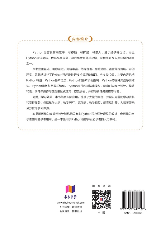 "Python语言具有高效率、可移植、可扩展、可嵌入、易于维护等优点,而且Python语法简洁,代码高度规范,功能强大且简单易学,是程序开发人员必学的语言之一。 本书注重基础、循序渐进、内容丰富、结构合理、思路清晰、语言简练流畅、示例翔实,系统地讲述了Python程序设计开发相关基础知识。全书共10章,主要内容包括Python概述、Python基本语法、Python的基本流程控制、Python的4种典型序列结构、Python函数与函数式编程、Python文件和数据库操作、面向对象程序设计、模块和包、字符串操作与正则表达式应用,以及并发、并行与多任务编程等内容。 为提升学习效果,本书结合实际应用,提供了大量的案例,并配以完善的学习资料和支持服务,包括教学大纲、教学PPT、源代码、教学视频、配套软件等,为读者带来全方位的学习体验。 本书既可作为高等学校计算机相关专业Python程序设计课程的教材,也可作为自学者使用的参考用书,是一本适用于Python程序开发初学者的入门教材。 "