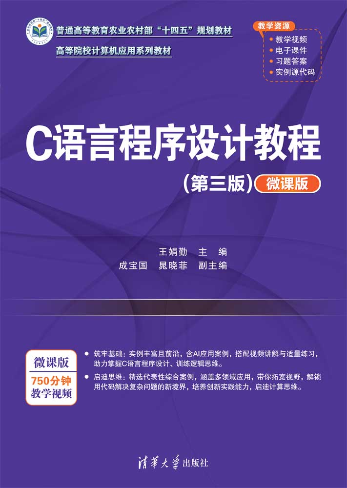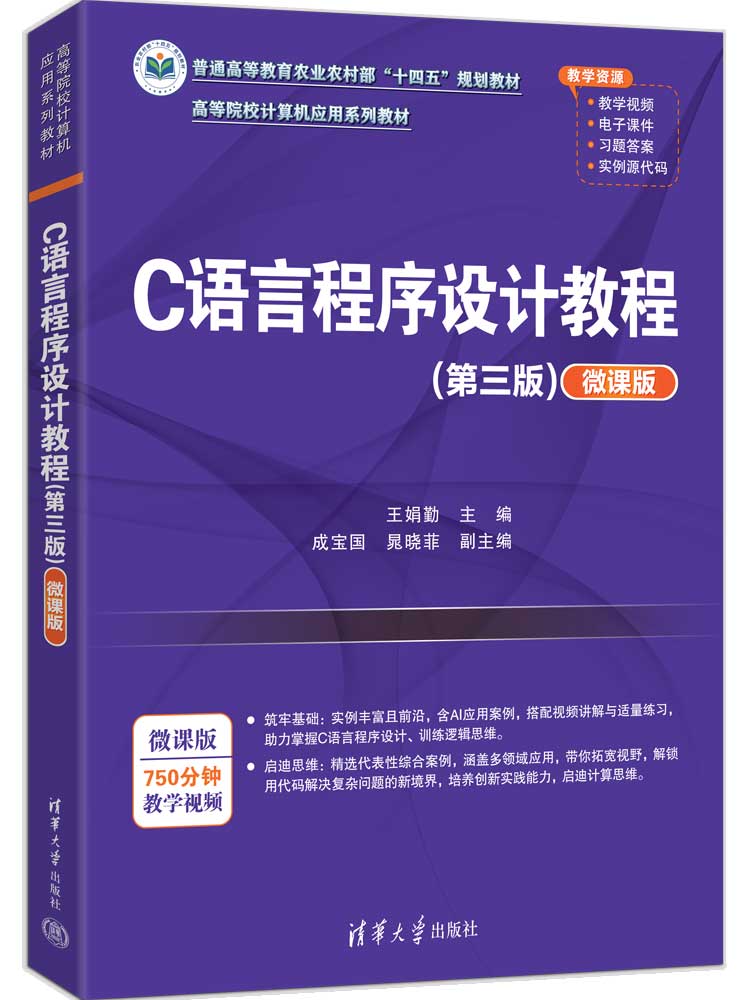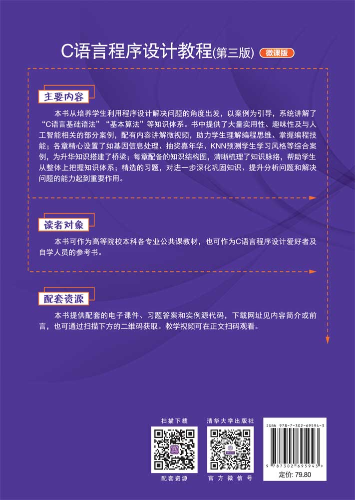 "《C语言程序设计教程(第三版)(微课版)》从培养学生利用程序设计解决问题的角度出发,以案例为引导,介绍了C语言程序设计基础、基本数据类型、数据运算、程序的基本结构、数组、指针、函数、结构体、共用体、枚举类型、文件、底层程序设计和编译预处理等内容。书中提供了丰富的实用案例、趣味性知识及与人工智能相关的实例,配有微视频讲解,对问题做了深入浅出的分析和总结,有助于引领读者理解编程思维和学习编程技能;每章都配有综合案例,为升华知识提供桥梁;各章的知识结构图,有助于学生理清知识脉络;精选的典型习题,对进一步深化基础知识、提升分析问题和解决问题的能力具有重要作用。 本书采用导学、易学编写策略,每章安排有内容提示、教学基本要求、微视频讲解和总结,正文组织本着由浅入深、循循善导的原则,突出重点和难点。全书逻辑清晰,层次分明,例题丰富。本书既可作为高等院校本科各专业的公共课教材,也可作为C语言程序设计爱好者及自学人员的参考书。 本书配套的电子课件、习题答案和实例源代码可以到http://www.tupwk.com.cn/downpage网站下载,也可以通过扫描前言中的二维码下载。扫描正文中的视频二维码可以直接观看教学视频。"