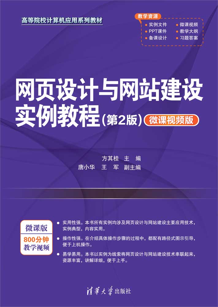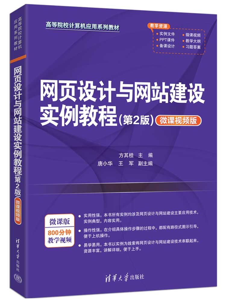 "《网页设计与网站建设实例教程(第2版)(微课视频版)》通过精选案例引导读者深入学习,以简明生动的语言和实例式教学方式,由浅入深地介绍了网页制作的过程,详细讲解了实践中的经验和技巧,并系统地介绍了网站建设的相关知识及应用方法。本书从实用的角度出发,图文并茂,将理论与实践相结合,每个实例都提供了详细的步骤,便于读者学习。 配套资源中包含了本书所用的课件范例源文件及素材。为了便于读者自主学习并提高实践能力,本书提供了配套微课视频,视频涵盖教材的全部内容和实例,并配有全程语音讲解与真实操作演示。 本书可作为高等院校计算机、多媒体、电子商务等专业的教材,也可作为信息技术培训机构的培训用书,还可作为网页设计与制作人员、网站建设与开发人员、多媒体设计与开发人员的参考书。"