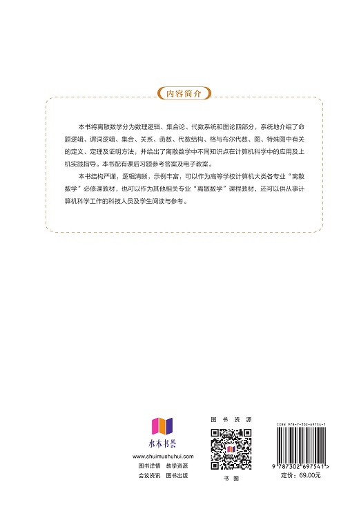 全书结构严谨,逻辑清晰,示例丰富,可以作为高等学校计算机大类各专业“离散数学”必修课教材,也可以作为其他相关专业“离散数学”课程教材,同时,也可以供从事计算机科学工作的科技人员及学生阅读与参考。