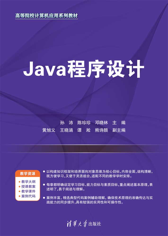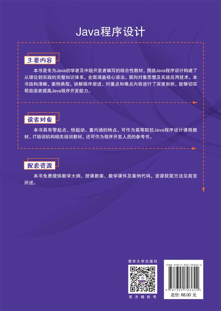 "《Java程序设计》系统地构建了Java程序设计的完整知识体系,全面涵盖了核心语法、面向对象思想及实战应用技术三大模块。本书内容结构分为四个层次:基础语法篇介绍变量控制、流程结构等过程式编程基础;面向对象篇介绍封装、继承、多态三大特性及其相关应用;技术支撑篇讲授异常处理机制与集合框架等系统级组件;应用实践篇讲授IO流操作、并发编程、网络通信以及JDBC数据库开发等工程技能。本书以构建知识框架和培养面向对象思维为核心目标,帮助学习者建立系统化的技术认知。全书采用理论与实践相结合的方式,精选典型代码案例辅助理解,确保技术原理的准确传达与实践能力的同步提升。 本书兼具学术深度与实践应用价值,既可作为高等院校计算机专业Java程序设计课程的教材,也适合IT培训机构用作高级开发课程的教材。同时,本书也适合具有编程基础的自学者作为技术提升的指南。随书提供的在线资源平台包括教学课件、习题答案及扩展案例,构建了一个多维度的学习支持体系。"