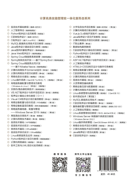 前言 本书是编者精心编写的介绍C语言程序设计基础知识、基本方法及部分进阶应用的教材,融合了编者多年C/C++工程实践和教学领域经验。编者希望读者能够通过本书学会并掌握C语言相关知识,并将C语言应用于工程实践中,或者为后续的软件工程技术学习奠定较好的基础。 C语言是一门优秀的程序设计语言,从它被设计和发布以来,创造了若干个奇迹: 知名的计算机操作系统是使用C语言设计和编码的;需要实时控制和实时响应的智能设备是使用C语言设计和编码的;现代的很多程序设计语言本身是使用C语言设计和编码的。C语言亦是优雅而严谨的: 其严谨的逻辑有助于培养良好的程序设计思维;它具有较好的可扩展性,而这种可扩展性只需要提供函数库即可完成;它是仅次于汇编语言的高效代码编译和生成能力,但是,其表达能力和可用性又大大高于汇编语言;基于C语言生成的机器代码具有极快的执行效率。学好C语言,可以为后续的类似Java语言、Python语言甚至SQL语言等语言类课程的学习奠定较好的基础。 本书全面介绍了C语言程序设计的基础知识以及部分高级知识,在进行知识介绍的同时,在适当的章节,结合工程应用实践对知识的应用进行介绍。本书配套的微课,对重点、难点以及其他补充知识进行介绍,以期读者在学习和掌握C语言基础的同时,了解与C语言相关的其他知识。 本书按以下顺序进行内容组织和介绍。 第1章介绍了C语言的简单历史、安装C语言开发环境、C语言程序的结构,详细介绍了信息输出语句的使用,以期为后续的知识介绍打好基础。本书使用企业级工程化工具CLion作为C语言程序开发工具。 第2章介绍了C语言基本的数据类型,包括常用的int类...