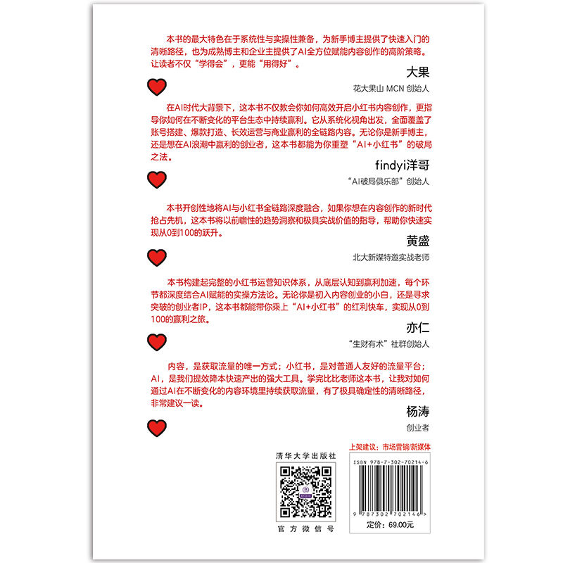 1. 本书从0到1打造高赢利小红书账号,AI全流程赋能提升10倍创作效率,助你轻松抢占流量红利! 2. 让创作者告别内容和流量卡点,实现撬动时间和资源的杠杆,领先于行业均值和时代,是这本书的使命。