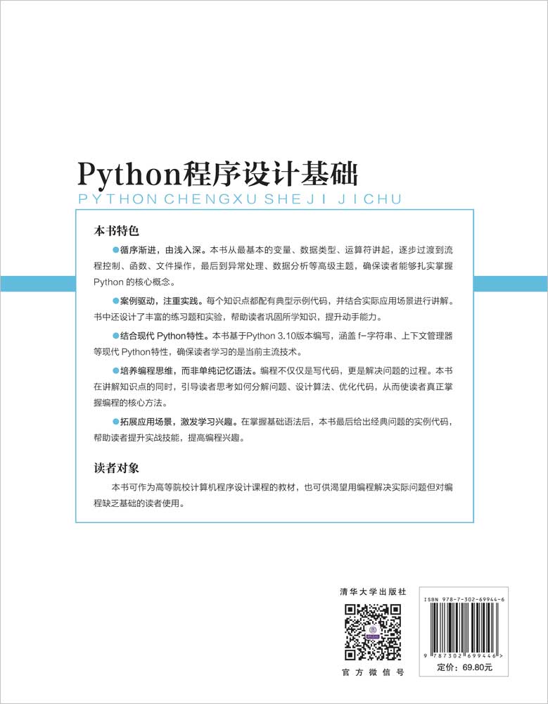 "?循序渐进,由浅入深。本书从最基本的变量、数据类型、运算符讲起,逐步过渡到流程控制、函数、文件操作,最后到异常处理、数据分析等高级主题,确保读者能够扎实掌握Python 的核心概念。