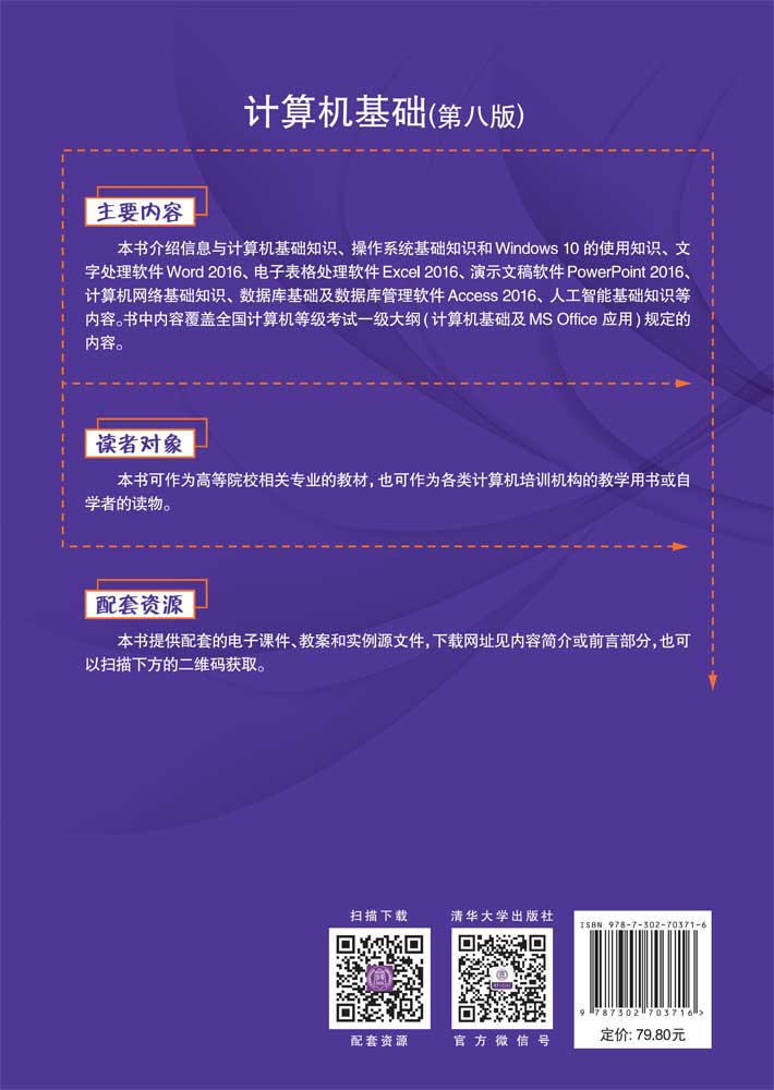 "《计算机基础(第八版)》介绍信息与计算机基础知识、操作系统基础知识和Windows 10的使用知识、文字处理软件Word 2016、电子表格处理软件Excel 2016、演示文稿软件PowerPoint 2016、计算机网络基础知识、数据库基础及数据库管理软件Access 2016、人工智能基础知识等内容。书中内容覆盖全国计算机等级考试一级大纲(计算机基础及MS Office应用)规定的内容。 本书图文并茂、重点突出、通俗易懂、实用性强,既可作为高等院校相关专业学生学习信息与计算机基础知识的教材,又可作为各类计算机培训机构的教材或自学者的读物。 本书配套的电子课件、教案和实例源文件可以通过http://www.tupwk.com.cn/downpage网站下载,也可以扫描前言中的二维码下载。"