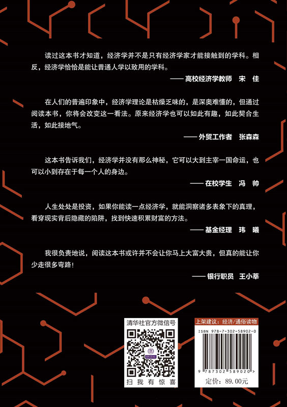 本书的重点不在于教授读者那些深奥的理论,或者让读者学习数学、图表之类的工具来分析经济问题,而是要逐步引导读者,让读者能像经济学家一样思考,用经济学家的思维去思考问题,用经济学方式去解决问题。本书能让你学会选择,从而做出正确决策,理性消费,感性生活。