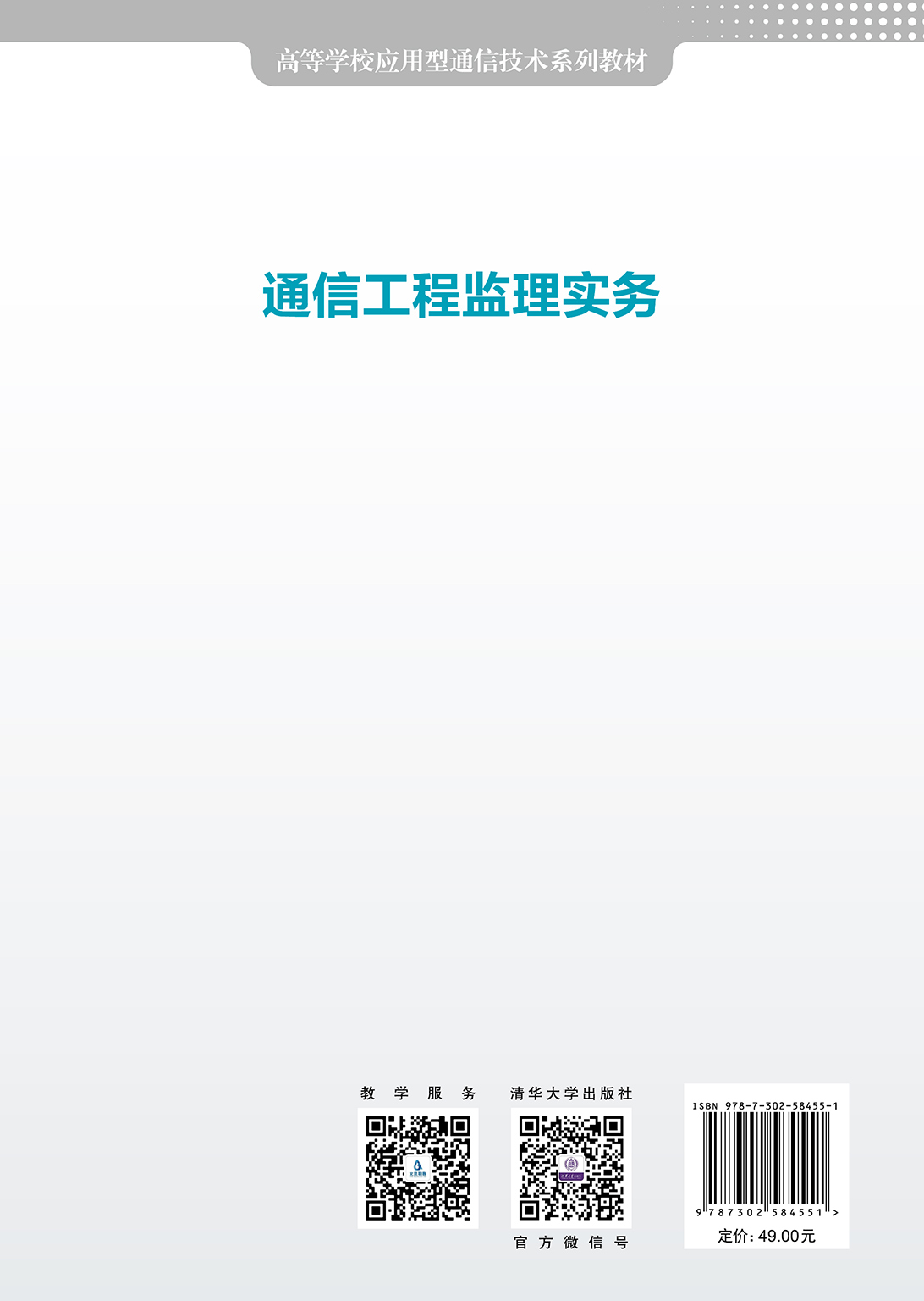 本书内容分为两大部分: 第1部分通信工程监理应知,主要介绍通信监理需要掌握的基本理论和基础知识; 第2部分通信工程监理应会,主要介绍工程施工阶段典型的15个监理工作任务以及施工现场监理日常工作任务,并给出通信管道、线路、设备安装三大典型通信工程项目的质量控制要点和安全管理细节。 本书从通信建设工程施工监理员的角度出发,理论适度够用,侧重应用,适用于刚刚步入通信工程监理领域的人员,可作为高职高专通信技术、通信工程设计与监理等专业的教材,也可作为广大企事业单位工程管理人员了解通信工程监理工作的入门教材。