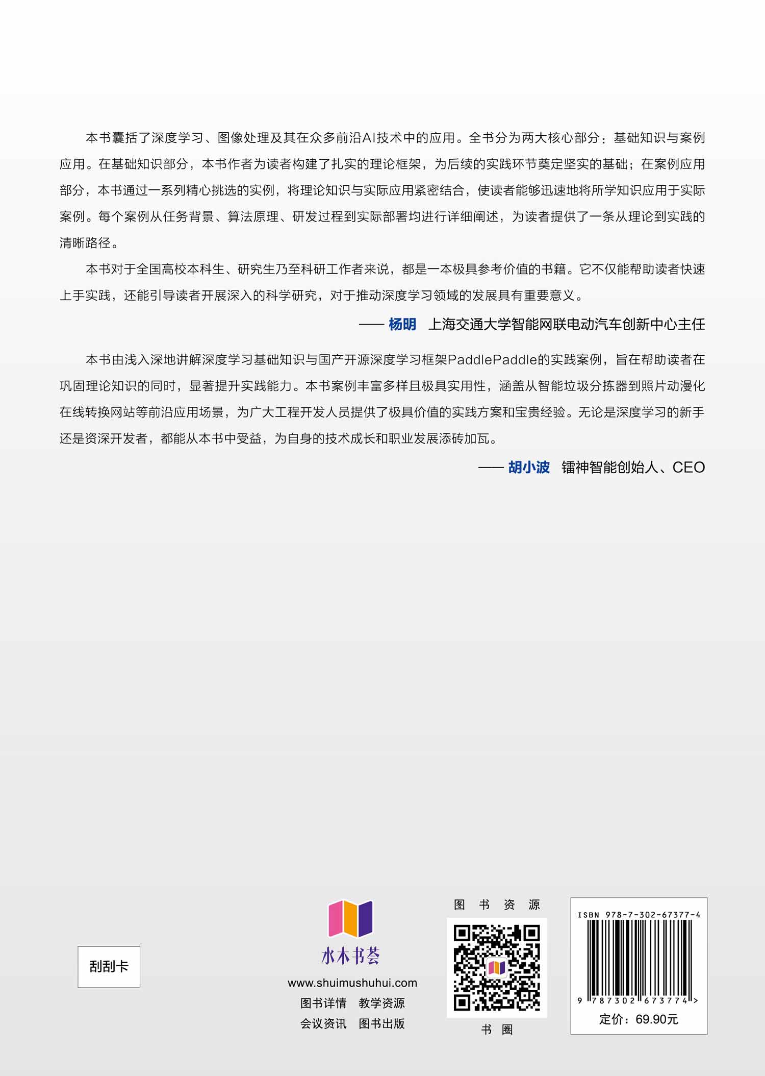 "本书基于国产开源深度学习框架PaddlePaddle进行编写,全面、系统地介绍了PaddlePaddle在数字图像处理中的各种技术及应用,书中项目实例全部采用动态图版本实现。全书共8章,分别介绍了基于深度学习的图像分类、目标检测、语义分割、实例分割、关键点检测、风格迁移等内容,所有知识点均通过实际项目进行串联,旨在帮助读者在掌握基本深度学习算法原理的基础上,扩展项目实操能力,达到学以致用的效果。 本书可作为全国高等学校计算机、人工智能等专业的“深度学习”课程教材,主要面向相关领域的教师、在读学生和科研人员,以及从事深度学习与图像处理的工程技术人员和爱好者。 "
