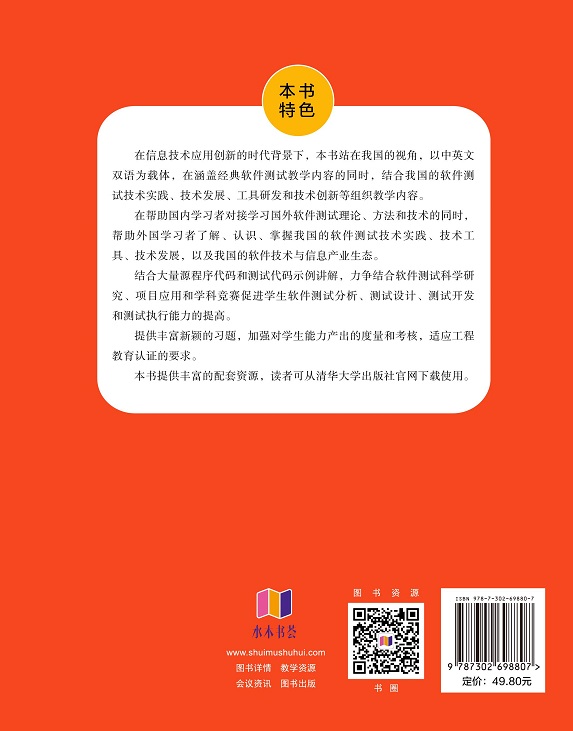 "在信息技术应用创新的时代背景下,本书站在我国的视角,以中英文双语为载体,在涵盖经典软件测试教学内容的同时,结合我国的软件测试技术实践、技术发展、工具研发和技术创新等组织教学内容。
