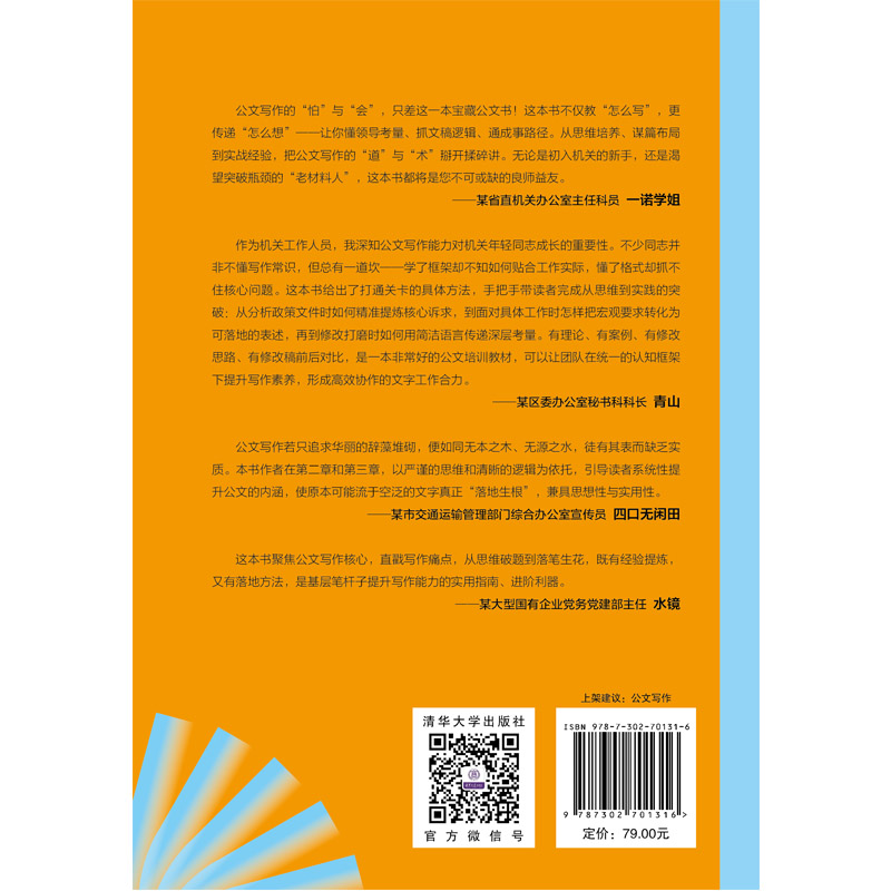 "本书围绕“公文写作能力提升”这一主要任务,从思维认知和实践运用两方面着手,以作者一对一辅导数百名学员经验为基础,提炼出公文写作者各阶段面临的共性、典型问题,并给出对应的解决办法。同时,手把手讲解汇报、发言、沟通、调研、宣传等各类公文的写作思路、常见问题及注意事项,让读者进入具体情境思考,进而练习,从而达到从“知道”到“做到”的目的。 本书结合作者多年“写”的心得和“教”的经验,自成一套方法论,跟着这套方法一步步学,就如同一位专业写作顾问在身边手把手教,直击写作痛点,解决实际问题,系统提升公文写作水平。"