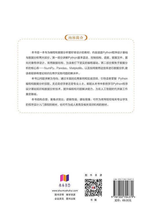 "本书是一本专为编程和数据分析爱好者设计的教材,内容涵盖 Python 程序设计基础与数据分析两大部分。第一部分讲解Python基本语法、控制结构、函数、数据文件、面向对象程序设计、常用数据结构,为读者打下坚实的编程基础。第二部分聚焦于数据分析的核心库——NumPy、Pandas、Matplotlib,以及如何使用这些库进行数据分析,使读者能够将理论应用于实际问题的解决中。 本书以问题求解为导向,通过丰富的应用案例和实战项目,引导读者掌握 Python编程和数据分析技能。无论是初学者还是专业人士,都能从本书中系统学习Python程序设计基础知识和数据分析技术,提升编程和问题解决能力,为在人工智能时代开展工作奠定基础。 本书结构合理,重难点突出,逻辑性强,通俗易懂,可作为高等院校相关专业学生的程序设计入门课程的教材,也可作为成人教育及相关培训机构的教材。本书封面贴有清华大学出版社防伪标签,无标签者不得销售。"