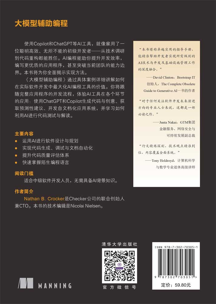 "使用Copilot和ChatGPT等AI工具,就像雇用了一位聪明高效、无所不能的初级开发者——从技术调研到代码重构都能胜任。AI编程能助你提升开发效率,编写更优质的应用程序,甚至突破当前团队的能力边界。本书将为你全面揭示实现方法。 《大模型辅助编程》通过具体案例详细讲解如何在实际软件开发中**化AI编程工具的价值。你将跟随完整应用程序的开发流程,体验AI工具在各个环节的应用:使用ChatGPT和Copilot生成代码与创意、获取预测性建议、开发自文档化应用系统,并学习如何利用AI进行代码测试与解读。 ?运用AI进行软件设计与规划 ?实现代码生成、调试与文档自动化 ?提升代码质量评估体系 ?快速掌握陌生编程语言"