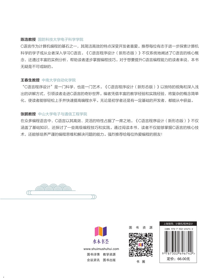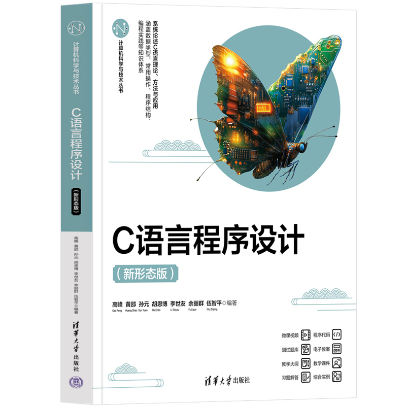 "本书是面向高等院校 C语言程序设计课程编写的教材,系统介绍 C语言程序设计的基础语法知识和程序设计方法。全书分为11章,主要内容包括:绪论,数据类型、运算符与表达式,标准输入和输出,选择结构程序设计,循环结构程序设计,数组与字符串,函数,指针,结构体,文件,项目案例实现。在每章的开头,通过对科技名人的介绍,引导读者认识学习方法与方式;在每章的结尾,通过对科技前沿知识的介绍, 帮助读者拓展知识面;全书在注重基础的同时,通过工程应用实际案例,将学与用紧密结合。本书语言通俗易懂、简洁流畅;内容叙述深入浅出、突出重点;精选大量典型例题,讲解由浅入深、细致详尽。充分体现了渐进式教学、启发式教学、分层式教学的思想。为便于读者高效学习,快速掌握 C语言编程与实践,本书配套完整的教学大纲、教学课件、程序代码、测试题库、习题解答,以及每章重难点微课视频。本书既可以作为高等院校与高职高专院校学生 C语言程序设计的教材,又可以作为 C语言相关工作人员和编程爱好者的参考用书。"