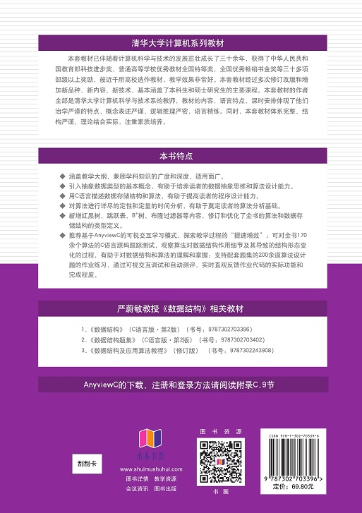 推荐基于AnyviewC的可视交互学习模式,探索教学过程的“提速增效”:可对全书170余个算法的C语言源码跟踪测试,观察算法对数据结构作用细节及其导致的结构形态变化的过程,有助于对数据结构和算法的理解和掌握;支持配套题集的200余道算法设计题的作业练习,通过可视交互调试和自动测评,实时直观反馈作业代码的实际功能和完成程度。