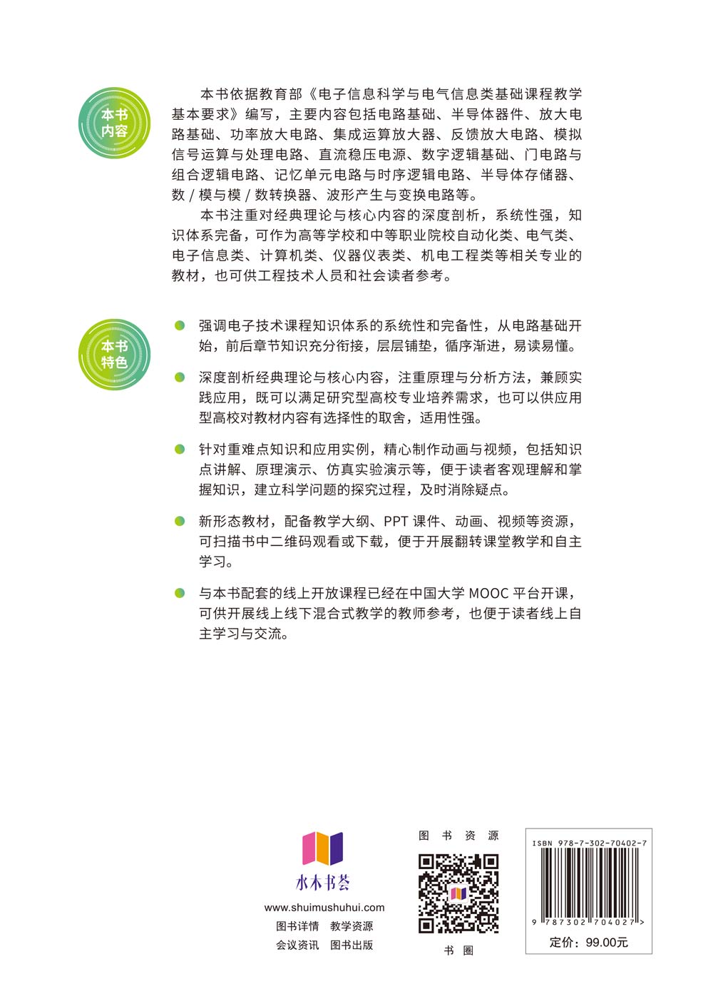 "(1)强调电子技术课程知识体系的系统性和完备性,从电路基础开始,前后章节知识充分衔接,层层铺垫,循序渐进,易读易懂。