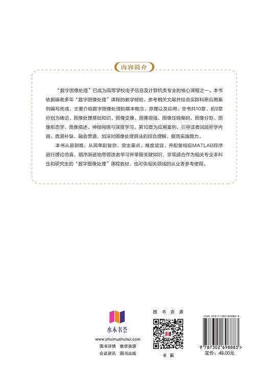 本书从易到难,从简单到复杂,突出重点,难度适宜,并配备相应MATLAB程序进行理论仿真,循序渐进地带领读者学习并掌握关键知识点,非常适合作为相关专业的本科生和研究生的“数字图像处理”课程教材,也可供相关领域的从业者参考使用。