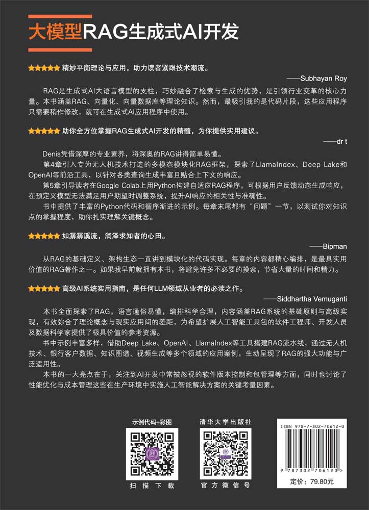 推荐序 在当今的人工智能领域,大模型技术无疑是最具有变革性的力量。然而,随着应用场景的不断拓展和深化,人们逐渐意识到单纯依赖预训练大模型的能力,往往难以满足复杂且多变的实际需求。正是在这样的背景下,检索增强生成(Retrieval Augmented Generation, RAG)技术应运而生,它为大模型与外部知识的高效融合提供了一条切实可行的路径,显著提升了模型生成内容的准确性、相关性和时效性。 我欣喜地看到,《大模型RAG生成式AI开发:使用LlamaIndex、Deep Lake和Pinecone》这本书精准地聚焦于RAG这一前沿技术领域,为广大开发者和AI爱好者带来了一场知识与实践的盛宴。从基础概念到高级应用,从单一模态到多模态扩展,从简易实现到模块化架构,书中内容循序渐进且全面深入,覆盖了RAG技术的方方面面。无论是对RAG的定义、生态系统的剖析,还是各类RAG模式的代码实现,本书都讲解得清晰透彻,并配以丰富的实例,使读者能够轻松上手且快速实践。 特别值得一提的是,书中结合了大量诸如Deep Lake、OpenAI、LlamaIndex和Pinecone等业界领先的工具和平台,通过实际案例展示了如何在不同的场景中搭建高效的RAG流水线,以解决实际问题。例如,在无人机技术、银行客户数据扩展和视频生成等多样化的应用场景中,RAG技术的强大威力得以充分彰显。这不仅有助于读者理解RAG的核心原理,更能够引导他们将所学知识灵活地运用到自身的项目中,从而实现从理论到实践的无缝对接。 此外,书中还探讨了如何通过专家人类反馈来提升RAG性能、构建知识图谱RAG等进...