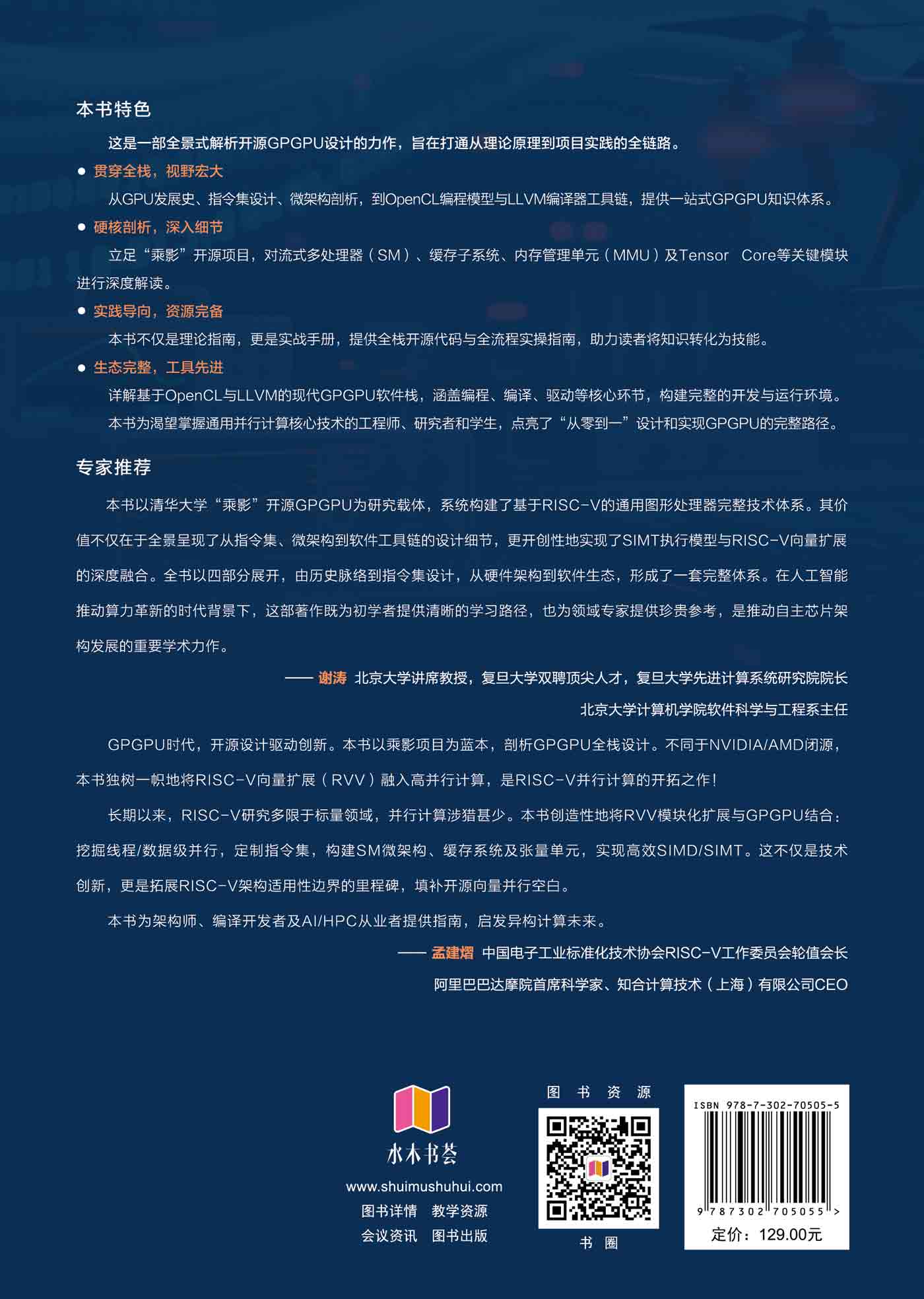 "本书聚焦通用并行计算GPGPU 技术及其实践,系统回顾GPU 从图形渲染到通用计算的演化历程,深入解析GPU指令集、微架构、软件工具链设计。本书分为4 部分:第 1 部分回顾GPGPU的时代背景与发展历程,介绍主要开源项目;第2 部分探讨GPU设计思想与指令集,并引出乘影GPGPU自定义指令集;第3 部分剖析乘影GPGPU硬件微架构,包括流式多处理器单元、CTA调度器、缓存子系统、内存管理单元以及张量计算系统等关键模块;第4 部分介绍基于OpenCL的编程模型、LLVM 编译器及驱动工具链,构建完整的GPGPU软件生态。本书兼顾理论与实操,既涵盖GPU并行计算的核心原理与关键技术,又结合乘影开源项目的实践示例,帮助读者深入理解并掌握现代GPGPU的设计与实现路径。 本书适合对GPU 架构、并行计算与开源硬件生态感兴趣的工程师、学生和研究人员阅读。 "