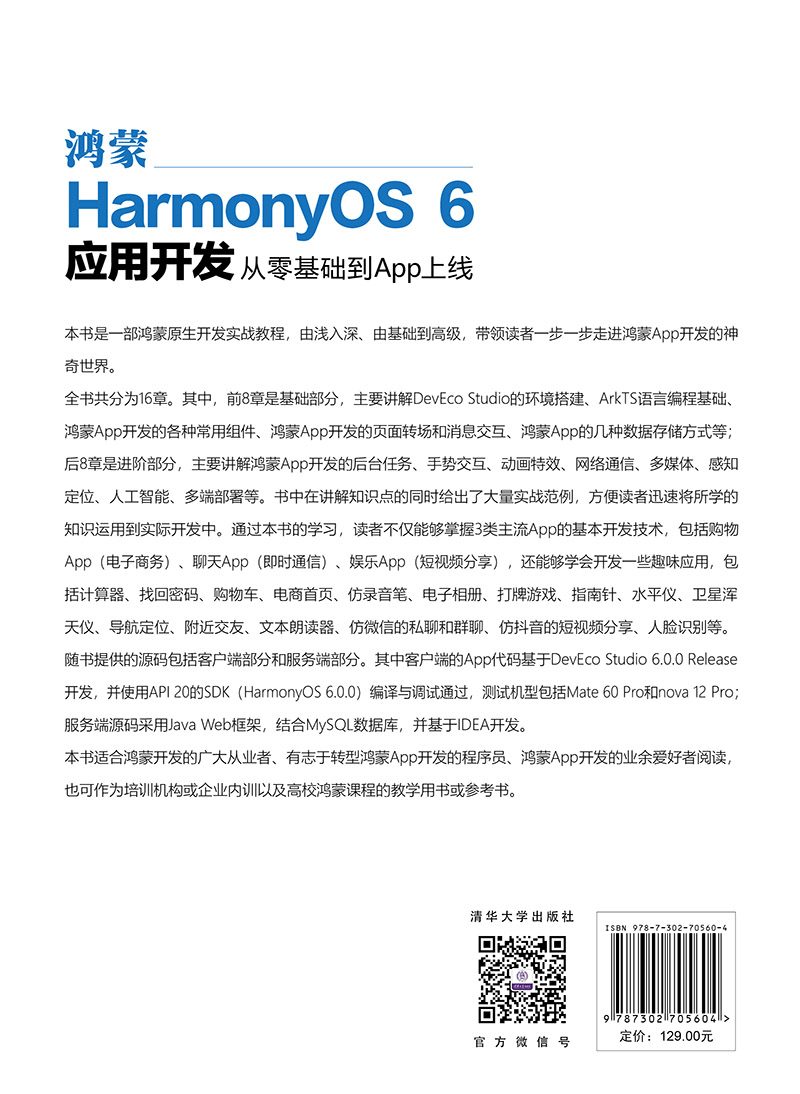 "《鸿蒙HarmonyOS 6应用开发:从零基础到App上线》是一部鸿蒙(HarmonyOS)开发实战教程,内容由浅入深、由基础到高级,带领读者一步一步走进鸿蒙App开发的神奇世界。《鸿蒙HarmonyOS 6应用开发:从零基础到App上线》共分为16章。其中,前8章是基础部分,主要讲解DevEco Studio的环境搭建、ArkTS语言编程基础、鸿蒙App开发的各种常用组件、页面转场和消息交互以及几种数据存储方式等内容;后8章为进阶部分,主要讲解鸿蒙App开发中的后台任务、手势交互、动画特效、网络通信、多媒体、感知定位、人工智能和多端部署等内容。书中在讲解知识点的同时,提供了大量实战范例,方便读者将所学知识迅速运用到实际开发中。通过本书的学习,读者能够掌握3类主流App的基本开发技术,包括购物App(电子商务)、聊天App(即时通信)和娱乐App(短视频分享)。此外,通过本书读者还将学会开发一些趣味应用,如计算器、找回密码、购物车、电商首页、仿录音笔、电子相册、打牌游戏、指南针、水平仪、卫星浑天仪、导航定位、附近交友、文本朗读器、仿微信的私聊和群聊、仿抖音的短视频分享、人脸识别等。 《鸿蒙HarmonyOS 6应用开发:从零基础到App上线》以HarmonyOS 6版本为基础,适用于鸿蒙开发的广大从业者、有志于转型鸿蒙App开发的程序员、鸿蒙App开发的业余爱好者,也可作为大中专院校与培训机构的鸿蒙课程教学用书。"