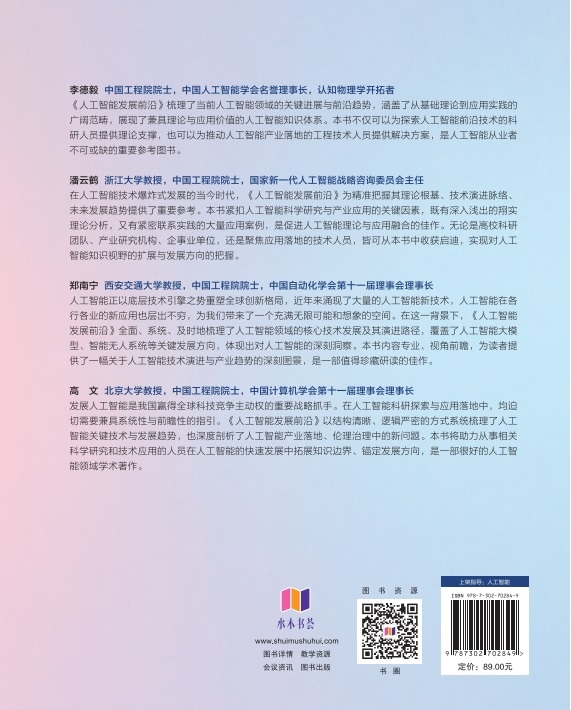 "本书系统梳理了人工智能领域的技术进展、前沿应用与未来趋势,内容覆盖从基础理论到产业落地的各个层面,全面展现了人工智能飞速发展所引发的重大变革。全书共15章,围绕人工智能的发展历程、研究领域、前沿技术、典型应用、安全伦理、产业格局、战略布局与产业发展等关键议题展开,重点讨论了无监督学习、自动机器学习、人工智能生成内容、人工智能大模型、智能体智能、智能无人系统、元宇宙、脑启发人工智能和人工智能驱动科学研究等当前**代表性的研究热点与技术方向。 本书不仅深入剖析了相关技术的原理与方法,还紧密结合国内外产业发展现状,融合**研究成果与典型应用案例,内容前沿、结构严谨、实用性强。本书可以作为人工智能及其相关专业本科生、硕士研究生、博士研究生的参考用书,也可以作为教育工作者、科技管理者、科研人员、工程技术人员、企业管理者、政策制定者,以及人工智能爱好者和跨领域应用者等进行系统学习和深入研究的参考资料。"