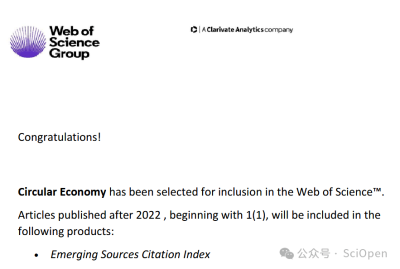 On 11th September, 2025, Circular Economy (ISSN:2773-1677) has been officially included in the ESCI (Emerging Sources Citation Index) database, which is part of the Web of Science Core Collection owned by Clarivate. Articles published in the journal since 2022, starting from Volume 1, Issue 1, will all be included in the ESCI database, and Circular Economy will receive its first impact factor in 2026!