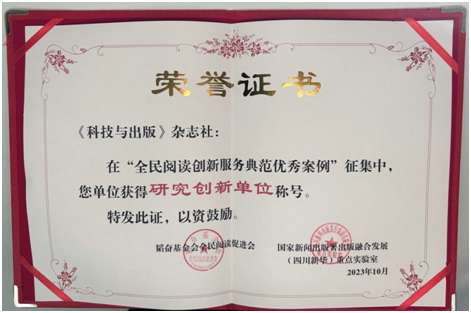 本次活动共有21家单位入选“全民阅读创新服务典范”优秀案例,其中,《科技与出版》杂志社荣获“全民阅读创新服务典范案例”研究创新单位称号。