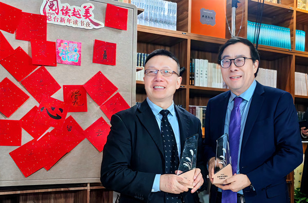 清华大学彭凯平教授(右)和清华大学出版社总编辑卢先和(左)出席活动并领取奖杯